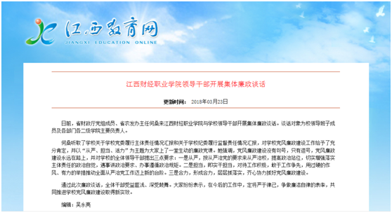日,江西教育网报道我校领导干部开展集体廉政谈话活动。