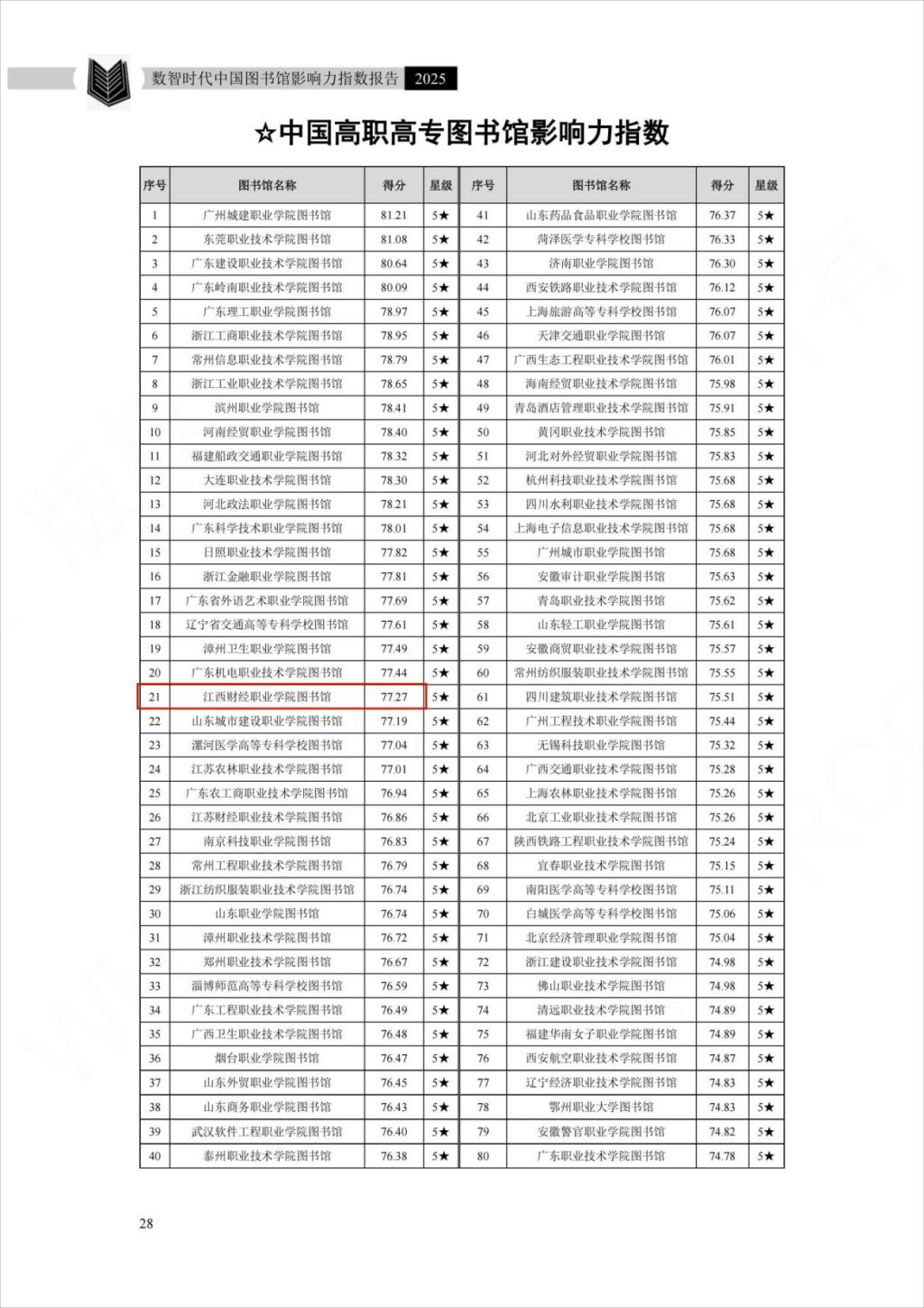 近日,由武汉大学中国科学评价研究中心、数字出版智能服务技术教育部工程研究中心研发的《数智时代中国图书馆影响力指数报告(2025版)》正式发布。我校图书馆获五星图书馆评价,蝉联中国高职高专图书馆影响力排行榜江西省第1位,全国排名由2024年的第59位跃升至第21位,首次进入“职专院校图书馆影响力三十强”。该报告采用基础实力、网站影响力、新媒体影响力、 社会影响力、学术影响力五个维度对全国2919 家高校图书馆、1980 ...