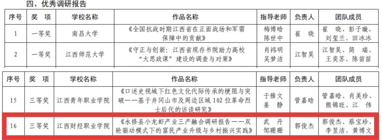 近日,中共省委教育工委印发了《关于公布2025年“牢记嘱托强国有我 行走赣鄱感恩奋进”江西省高校学子暑期大思政实践活动优秀实践成果评选结果的通知》。我校“赣商”文化分队的《永修县小龙虾产业三产融合调研报告——双轮驱动模式下的富民产业升级与乡村振兴实践》获优秀调研报告三等奖,“茶叶”文化分队的左金龙获优秀实践个人。此次获奖,是学校深入贯彻《教育强国建设规划纲要(2024—2035年)》精神、全面落实省委教育工委“文化赣鄱行”战略部署的重要成效,更是学校锚定“立德树人”根本任务、深化“三全育人”综合改革的生动实践。