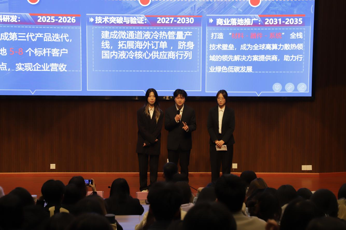 4月2日下午,决赛在八里湖校区行政楼二号报告厅举行。路演采用公开答辩形式,分为项目展示和评审答辩两个环节。在项目展示环节,各参赛团队立足专业所学,结合社会实际需求,从可行性、创新性、科学性和先进性等维度,全面阐述了作品的核心价值。参赛作品主题丰富,涵盖先进制造、新一代信息技术、新消费与文化创意、现代服务与社会治理等多个领域,充分展现了同学们活跃的创新思维。在答辩环节,评委们从创业计划的完善程度、创业实践的运营现状、创业团队的财务管理情况等方面进行提问,并给出针对性建议,帮助同学们定位问题、拓展思路,以便后续完善项目内容。