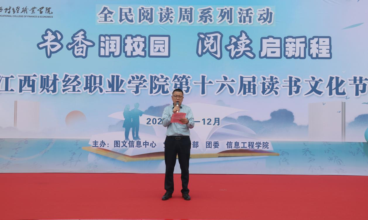 4月23日世界读书日,江西财经职业学院全民阅读周系列活动暨第十六届读书文化节在八里湖校区图书馆大楼正式开幕。校党委委员刘锋出席,相关职能部门、二级学院及300余名师生参加活动。