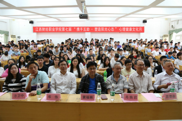 为秉承我校“务实、责任、合力”的精神,落实“五有”教育观,培养“四具备”人才,推动“四导工作”,深化“心理疏导”,丰富校园文化生活,关注青年学子心灵成长,同时也为了更好地迎接“5.25”大学生心理健康日的到来,5月4日下午4:30,由我校思政部主办、九江市心理学会协办,以“携手互助•塑造阳光心态”为活动主题的“江西财经职业学院第七届心理健康文化月”开幕式在综合楼阶梯教室五隆重举行。