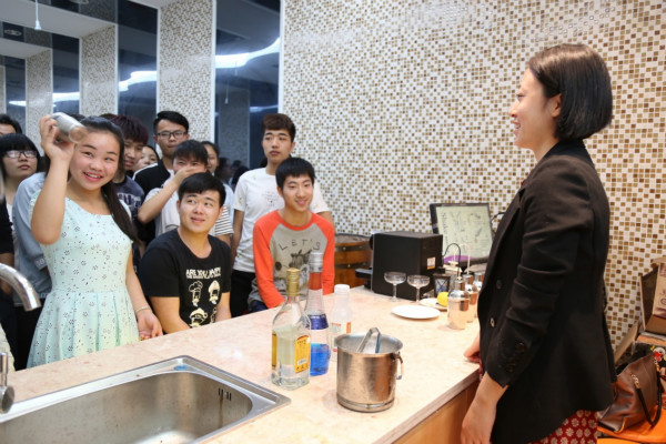 在旅游管理实训中心,讲解老师向学生介绍了旅游实景沙盘并带领大家参观了中西餐实训室和茶艺实训室。在中餐实训室,向学生介绍了中西餐的基本操作技能以及区别,用餐礼仪和餐饮文化。在茶艺实训室,简要介绍了茶具的使用和茶叶的识别与泡制等。在调酒实训室,调酒师向观摩学生介绍了各式酒具的功能及用途、表演了各式鸡尾酒的调制方法,学生饶有兴致的进行了现场学习。