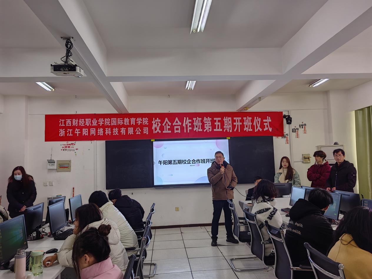2月28日下午,国际教育学院与浙江午阳网络科技有限公司合作开设的跨境电商班第五期开班仪式在综合楼401教室举行,浙江午阳网络科技有限公司市场部主管谢芳林,企业讲师刘光宇、何懿洁,国际教育学院党政班子、商务英语教研室主任和合作班全体同参加了开班仪式。