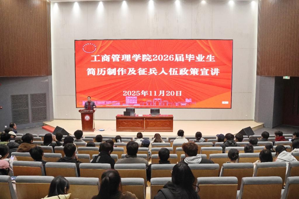 为扎实推动2026届毕业生就业工作,11月20日下午,工商管理学院于行政楼一号报告厅举行2026届毕业生简历制作指导与征兵政策宣讲会。学生工作处副处长刘磊主讲,学院领导、相关工作人员及毕业生200余人参加。