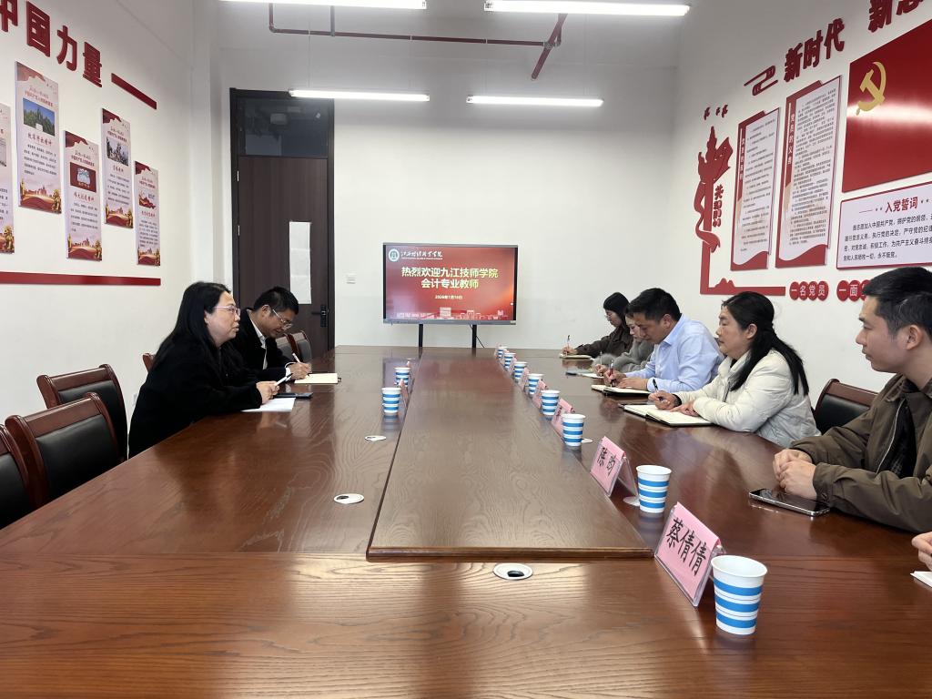 1月16日下午,九江技师学院会计专业教学团队在商贸服务系主任刘菲菲的带领下一行7人来访我校会计学院。会计学院院长万凯、副院长谭玉林热情接待。