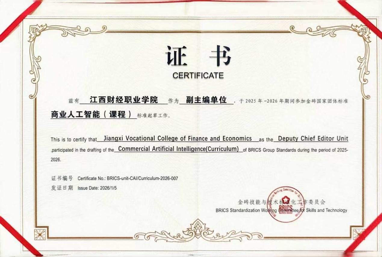 近日,金砖技能与技术标准化工作委员会正式向我校颁发证书,我校凭借在商业人工智能领域的教学积淀与专业影响力,被认定为金砖国家团体标准《商业人工智能(课程)》的副主编单位,五年高职部作为主要拟稿方深度参与了该标准的起草工作,这是我校职业教育国际化发展进程中的又一成果。