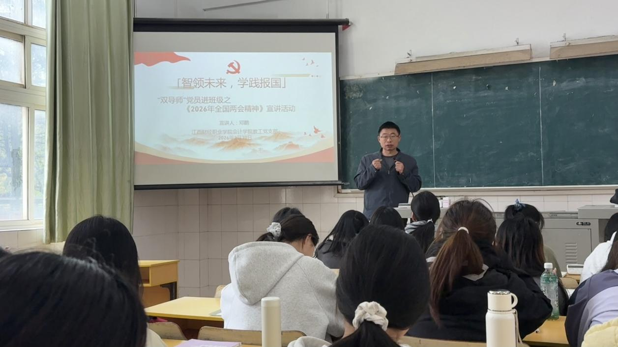 会计学院教工党支部为深入落实《2025级班级“双导师”实施方案》,充分发挥党员导师与专业导师的协同育人作用,于3月6日至31日组织28名导师深入2025级新生班级,开展“政治+专业”双导师进班级系列宣讲活动,实现28个班级全覆盖。本次活动聚焦2026年政府工作报告、2026年全国两会精神、树立和践行正确政绩观等主题,通过原文领读与案例分享相结合的方式,为新生搭建起思想引领与专业启蒙的桥梁。