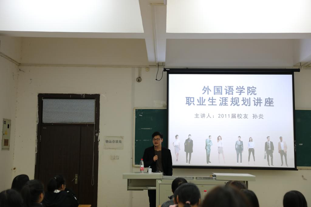 为进一步培养学生的创新创业意识,提高创新创业能力,指导学生做好职业规划,2019年11月22日下午,应外国语学院邀请,我校2011届优秀校友浙江乐为展览公司总经理孙炎在综合楼阶梯教室二,为毕业班学生作了题为“青春·梦想·奋斗”的讲座。