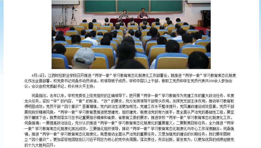 6月20日,江西教育网报道我院召开推进“两学一做”学习教育常态化制度化部署会。